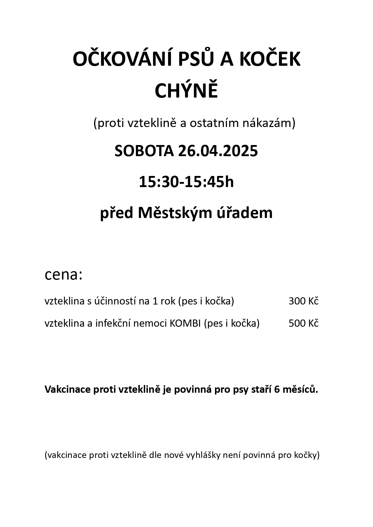 Proti vzteklině a ostatním nákazám. Očkování bude provádět MVDR. Vladimír Ondřej Brožek.