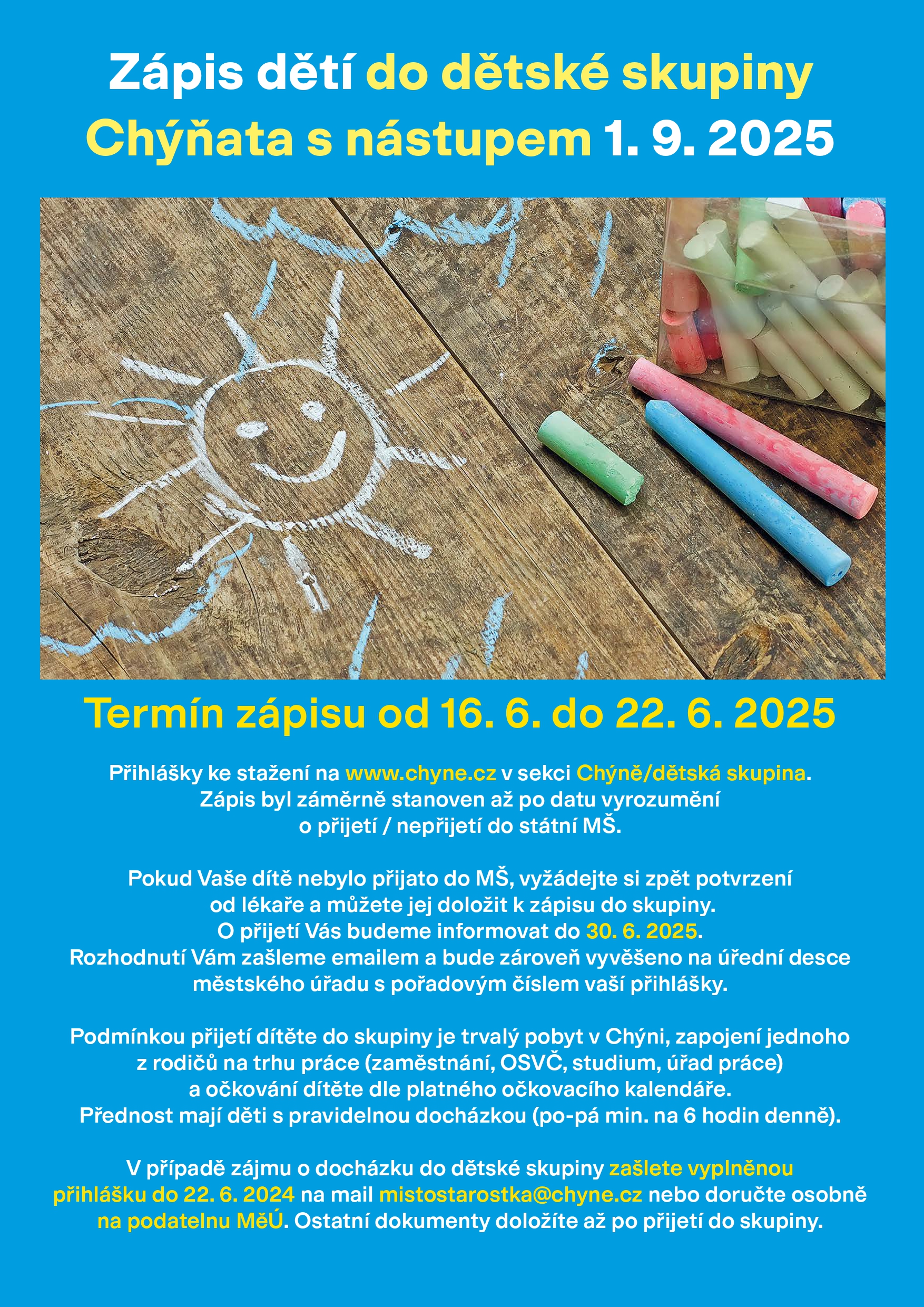 Místo: Zašlete vyplněnou přihlášku do 22. 6. 2024 na mail mistostarostka@chyne.cz nebo doručte osobně na podatelnu MěÚ.