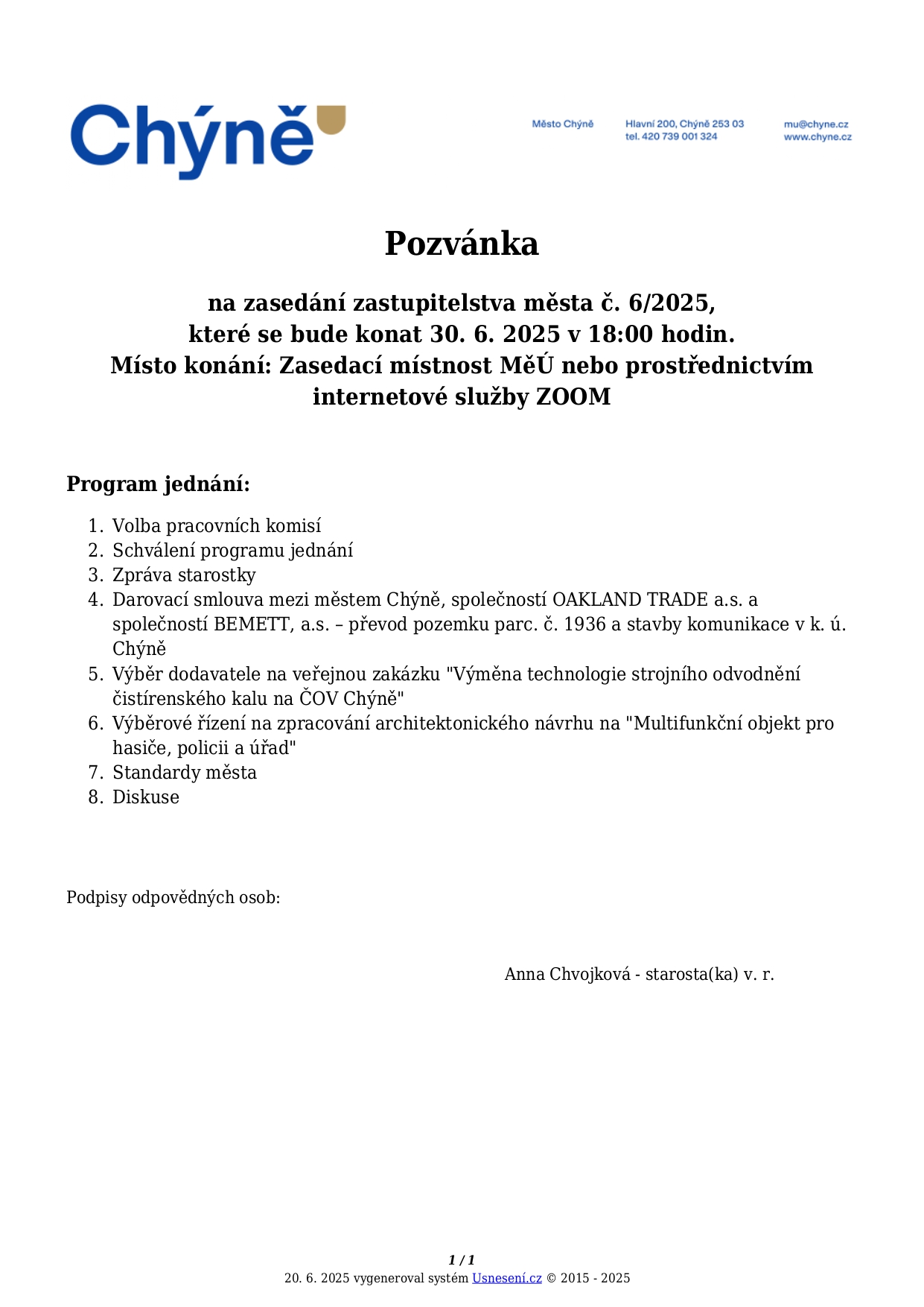 Zasedání Zastupitelstva města Chýně č. 6/2025