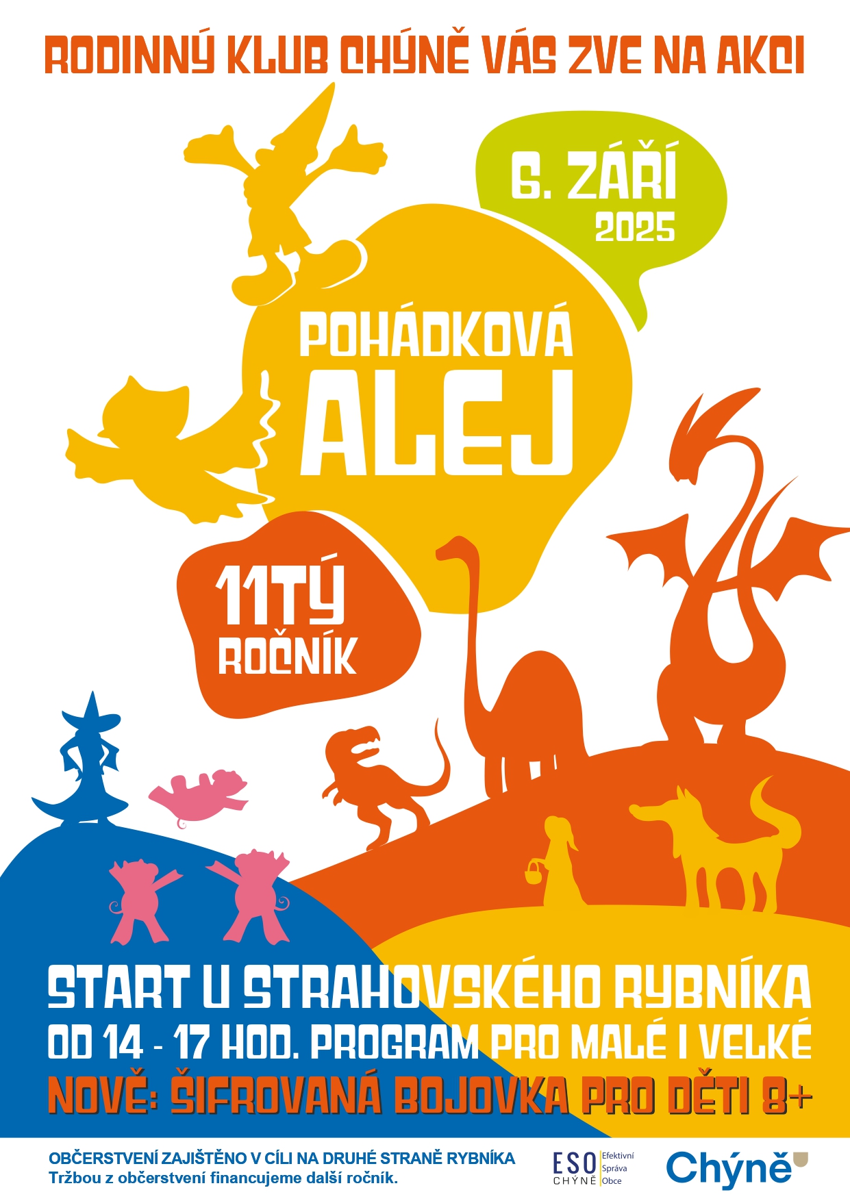 dovolujeme si Vás a zejména Vaše děti pozvat na 11. ročník Pohádkové aleje, který se uskuteční tuto sobotu 6. září 2025 u Strahovského rybníku v Chýni. Letos je start a cíl na druhé straně rybníka! Kromě tradiční pohádkové stezky pro menší děti je nově připravena i šifrovací hra pro děti starší 8 let. Děti si tak mohou potrápit hlavičky plněním různě náročných úkolů (které si samozřejmě mohou vyzkoušet i dospělí) a v cíli získat odměnu. Program probíhá mezi 14. a 17. hodinou a je tradičně zajištěno občerstvení a další doprovodný program. Tržbou financujeme další ročník.