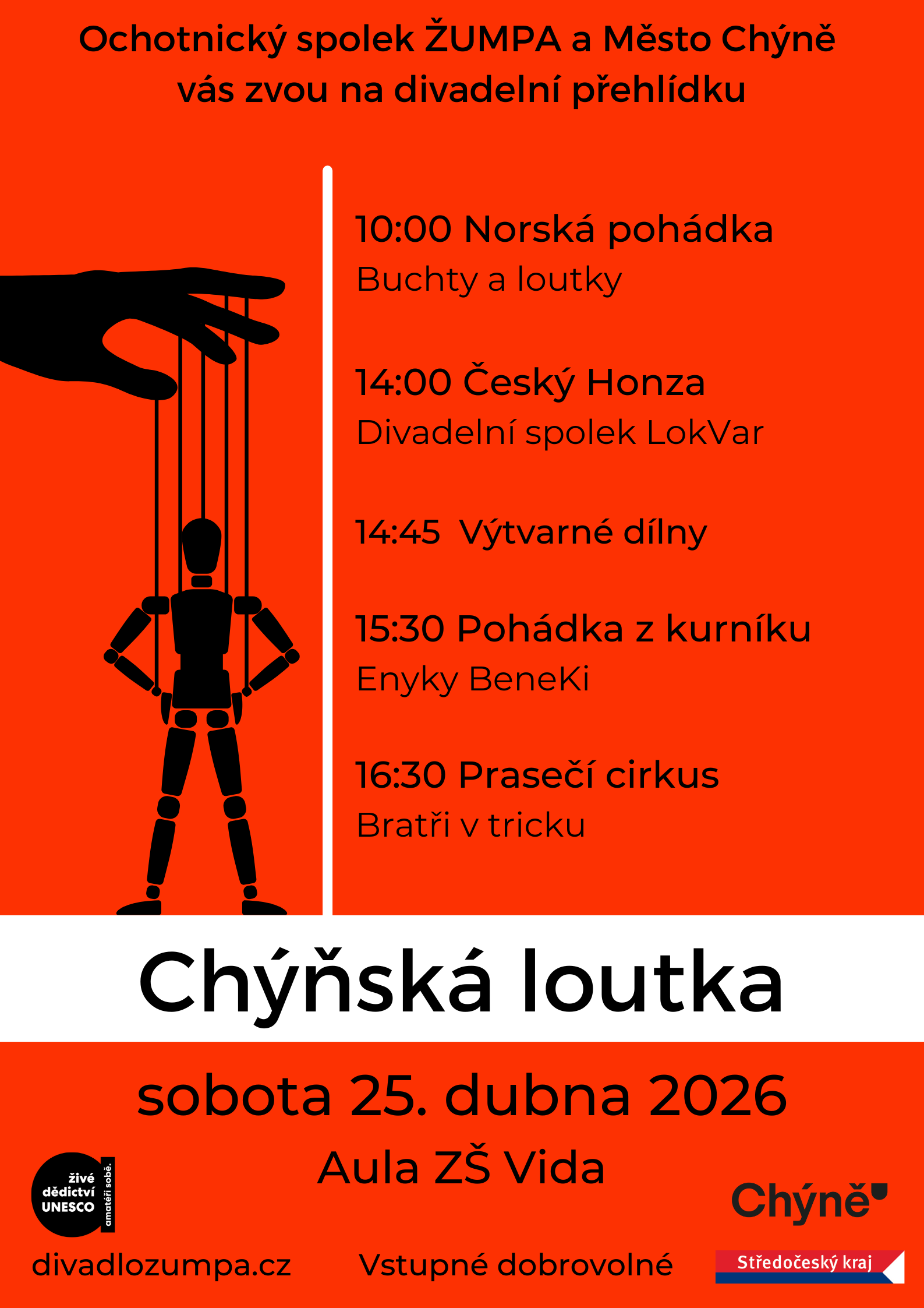 Ochotnický spolek ŽUMPA a město Chýně vás srdečně zvou na 5.ročník divadelní přehlídky Chýňská loutka. V letošním roce se uskuteční v sobotu 25. dubna 2026.